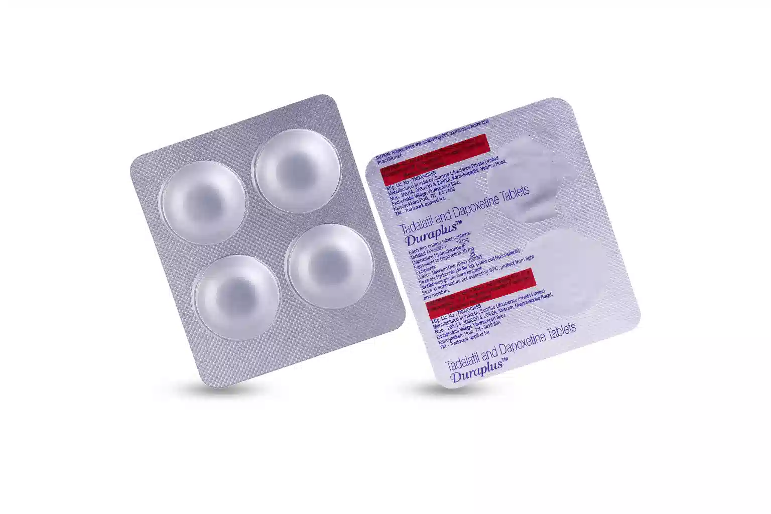 Duraplus is an oral formulation that is used for the treatment of Erectile dysfunction. It contains Dapoxetine (30 mg) and Tadalafil (10 mg) where Dapoxetine works by increasing the levels of serotonin, which improves control over ejaculation and increases the time taken for ejaculation. Tadalafil on the other hand works by dilating the blood vessels which increases the blood flow to the penile tissues. Â