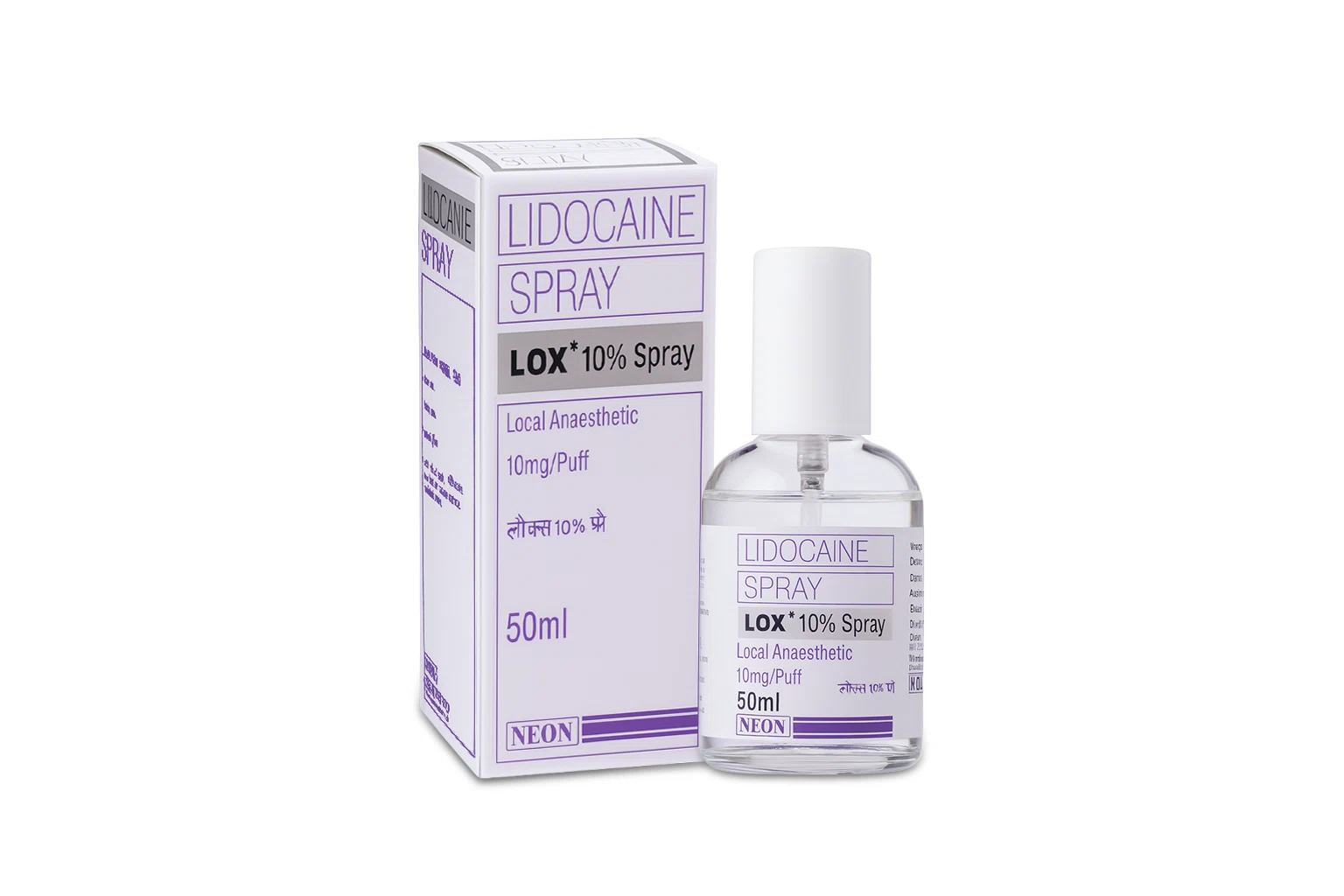 Lox 10% Spray contains lidocaine hydrochloride in a metered spray. Lidocaine is an amide local anesthetic widely used to produce topical numbness for skin and mucous membranes. This formulation delivers a concentrated dose in a convenient spray that acts faster than many creams and usually within minutes of application.