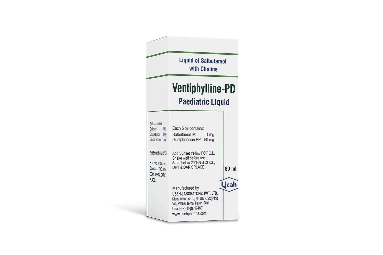 Ventiphylline Syrup is a combination, prescription respiratory syrup commonly formulated to contain a bronchodilator, mucolytic, and expectorant in a single, palatable oral liquid. This Levosalbutamol, Ambroxol, and Guaifenesin formulation helps to open the airways and mobilize mucus by acting rapidly through bronchodilation and targeted mucolytic and expectorant action so that the patients can breathe easier and recover comfort more quickly.